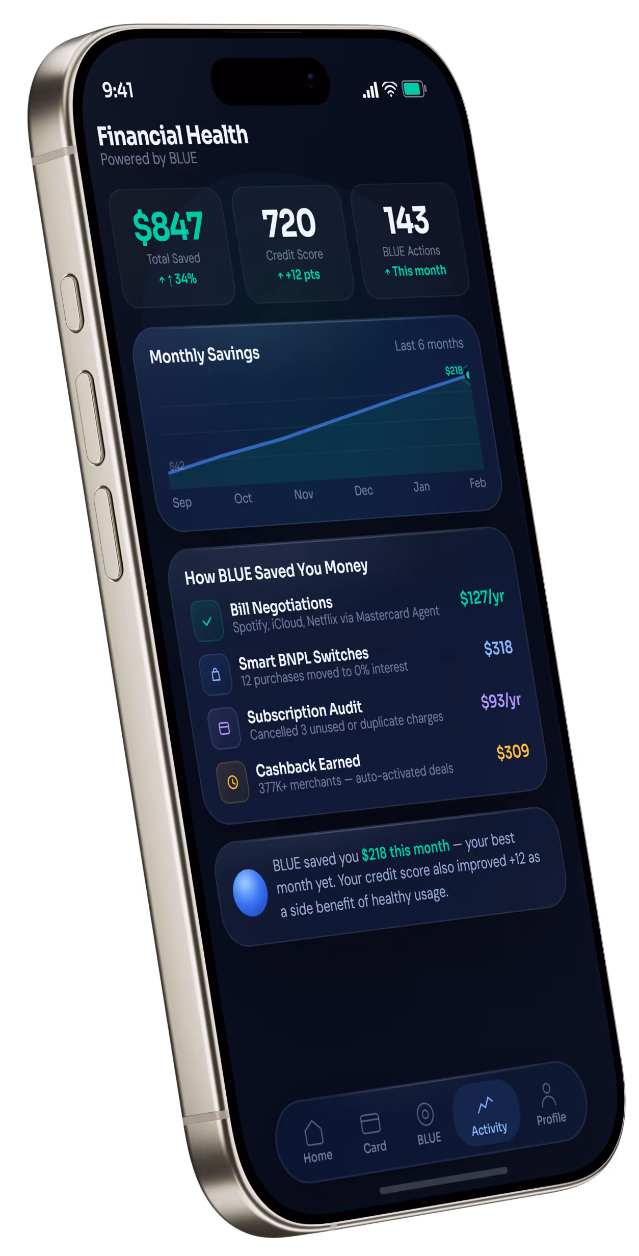 Once you're live, BLUE starts working — scanning deals, optimizing spending, maximizing rewards across 377K+ merchants. Your credit score improves along the way.